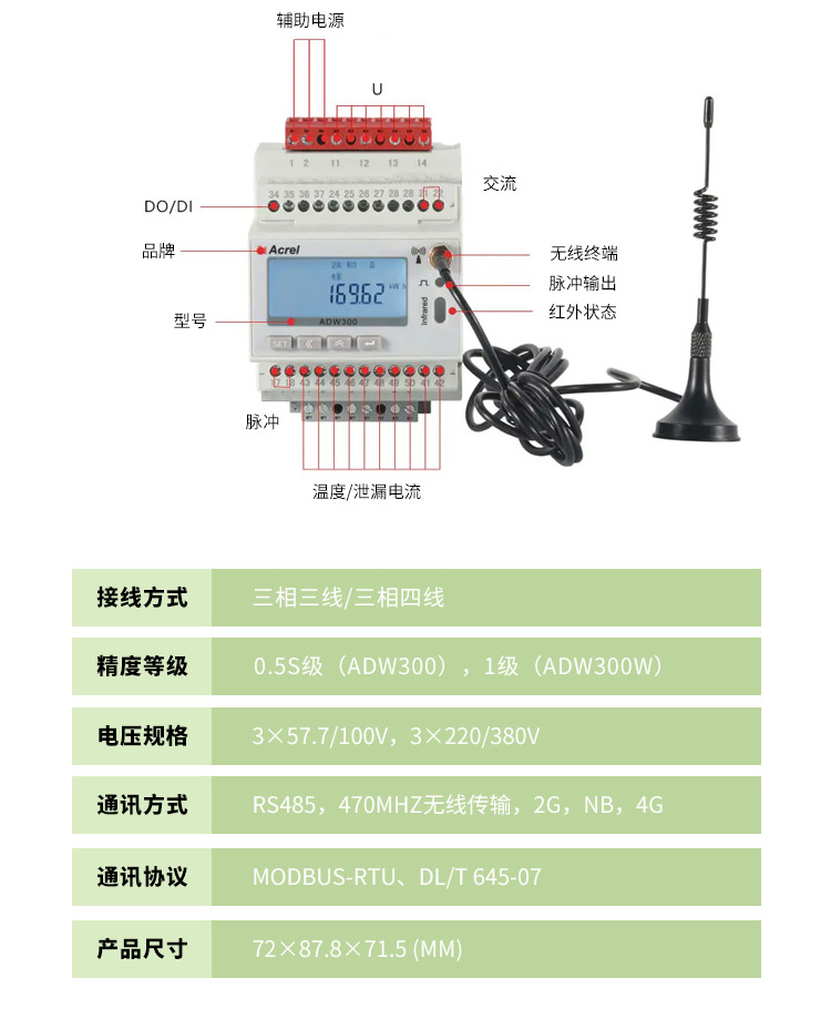 功能定位:ADW300-LRWAN 是集成 Lora无线通信与广域网(WAN,如4G)技术的物联网电表,支持三相有功电能计量、实时数据监测及远程集抄,适用于电力运维、环保监管、工业能耗分析等场景278。