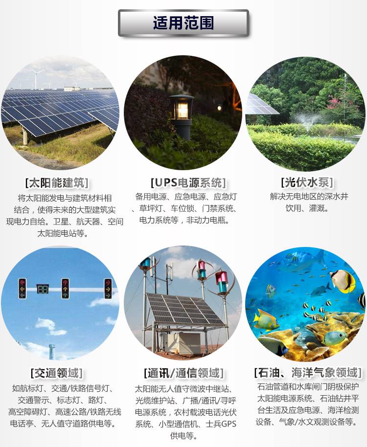 太阳能系统:作为太阳能发电系统的储能元件,将多余的太阳能转化为电能储存起来,供夜间或阴雨天使用。