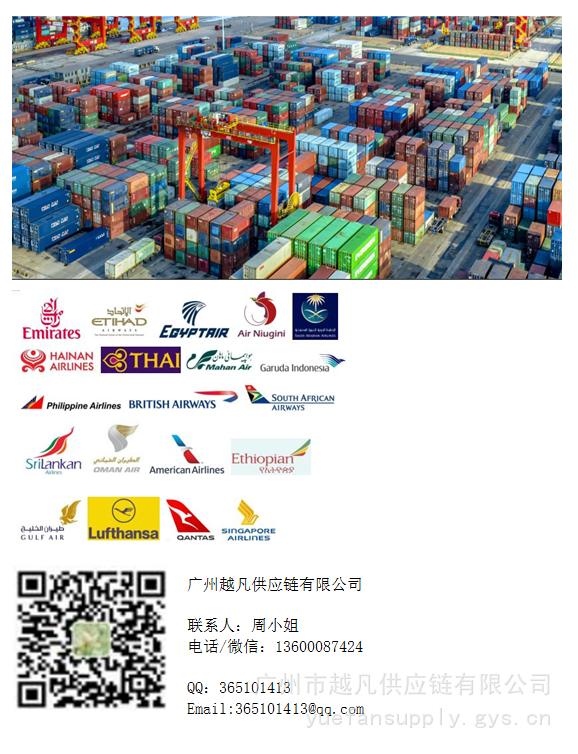 广州越凡供应链有十多年的国际物流操作经验,可承接广州、深圳、上海、香港等机场订舱出运,空运主要合作航司QR/EK/TK/UL/CZ/ET/UX/CA/CI/BR/KE/5J/NH,海运主要合作船公司YML/HMM/ONE /WHL /SITC /TSL /EMC/MSC/MSK/ CMA;优势航线区域:美国、加拿大、中南美、南美洲、非洲、东南亚、印巴、中东、欧洲、澳洲、中亚五国等。
