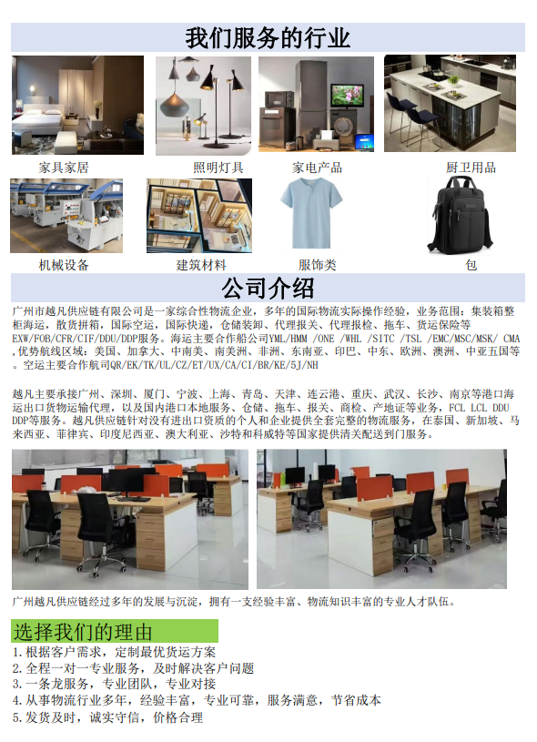 广州越凡供应链有服装,手袋,鞋帽,灯饰,五金制品,汽车配件、电子产品,机器设备、模具等货物的运输经验,可操作超重超长超大件货物,扎实的货运知识,严谨的操作流程,负责的操作团队。公司秉承诚实守信,合作共赢,客户至上,安全快速的经营理念。力求货物安全快速到达客户手里。
