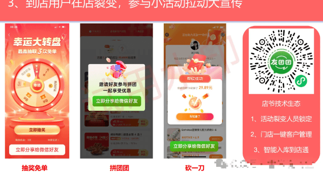模式落地依赖 “友客值店爷” 系统,该系统可追踪 20 层分享路径,实现实时分佣,同时绑定用户社交ID,通过准确触达唤醒沉睡客户。此外,“砍一刀”“幸运大转盘” 等互动工具,将裂变转化率提升 40%,进一步放大获客效果。