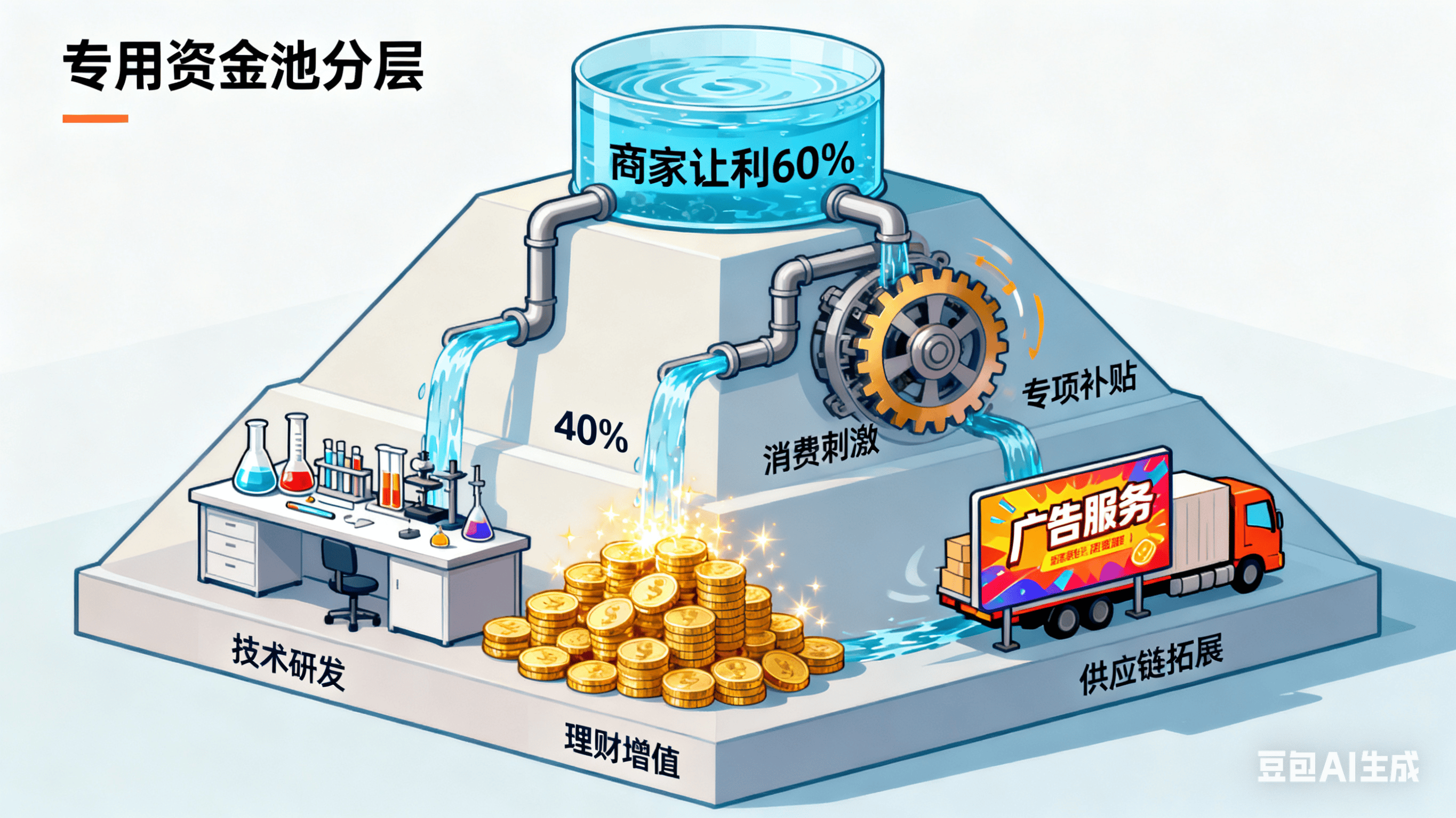 从平台层面来看,哥小兔通过 “专用资金池”(即商家让利的 60%)进行分层运营:其中 40% 作为专项补贴,用于刺激消费市场;20%投入到技术研发与理财增值领域,提升平台竞争力与资金效益;剩余收益则用于拓展供应链、广告等衍生服务,从多方面保障补贴的可持续性。