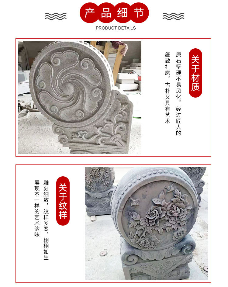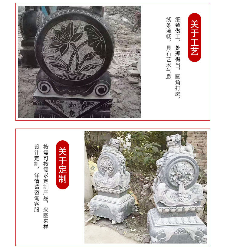 青石石门墩以其独特的纹理和稳定的色泽,在传统石雕中备受推崇。青石的天然质感不仅增添了门口的庄重气氛,还具备良好的耐候性能,适合户外长时间使用。惠安县龙创石雕工艺有限公司所加工的一对青石石门墩,将传统雕刻技艺完美融合现代审美,展现出门口传统石雕摆件的独特风貌。