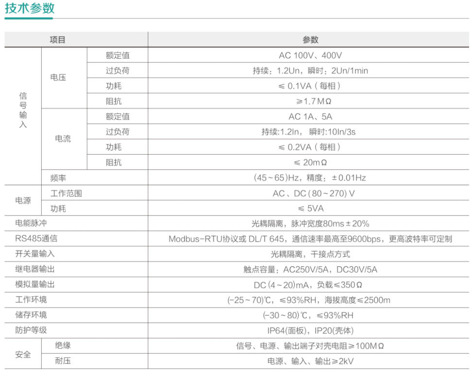 电能输出脉冲、RS485通信接口、开关量输入、继电器输出和模拟量输出