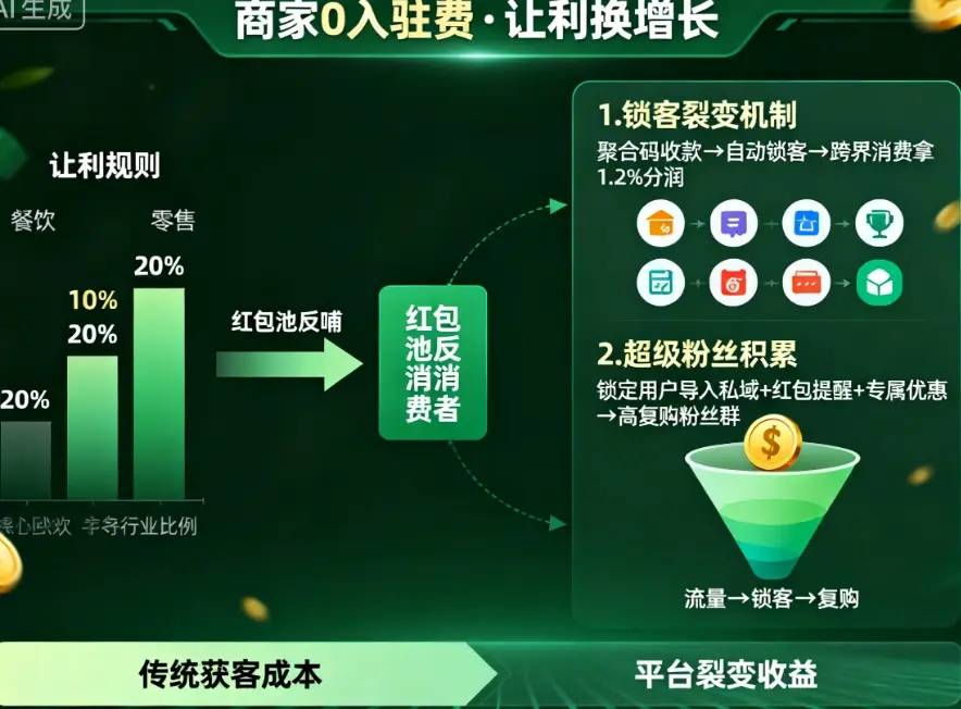 低成本入驻:零加盟费,平台仅收取1.3%服务费(传统平台如美团佣金达25%-30%),商家自愿让利部分进入红包池,同时获得1.2%的跨店收益(用户在其他合作商家消费的分润)。