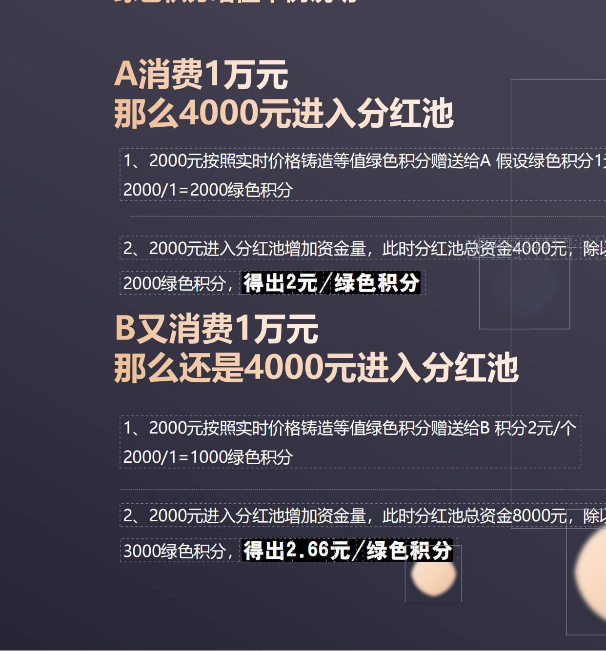 3个月后: 由于平台业务火爆,绿色价值池不断扩大,积分升值,他的3个积分现在价值315元。