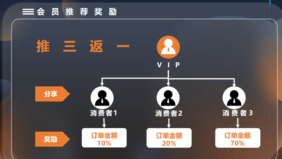 通过多级分销,形成一个以早期参与者为塔尖的团队结构,让有能力发展大规模团队的人获得高额回报,从而将他们与平台深度绑定,持续为平台贡献新流量和业绩。