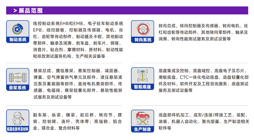 制动系统、转向系统、悬架系统、智能底盘、轻量化部件及材料、生产制造。