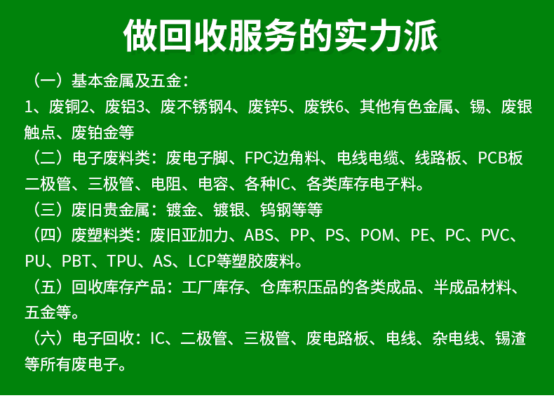 废铜回收、废钨钢回收、废锡回收、废线缆回收、废纸回收、废线路板回收、库存回收、模具回收、稀有金属回收 经营范围:一、废电子:电子脚、含银锡、无铅锡、含铅锡、锡渣、锡灰、锡膏、电容、IC、二极管、三极管、电阻、线路板、变压器、充电器、废电缆电线、库存货清仓等废品废料二、废金属:磷铜、红铜、紫铜、黄铜、青铜、白铜、漆包线铜、铜屑、铝(屑)、不锈钢、锌合金、废铁等废品废料三、废塑胶:废蜡烛、亚克力、吸塑、硅胶、菲林、ABS、PC、PP、PVC、475、PU、PA尼龙、POM赛钢、PS、PP、PET、PCB板等废品废料四、废电池:废钴酸锂粉、电池正负极、镍氢电池、镍镉电池、锂电池、聚合物电池、单晶硅多晶硅片等废品废料五、贵金属:废镍、钼、钨钢、钨丝、钛、铬、钴、铑、铅、镀金、镀银、金、银靶等废品废料六、机械设备:发电机、注塑机、变压器、稳压器、车床、冲床、铣床、磨床、镗床、波峰焊、锡炉、回流焊、切机、厨房设备、大小空调、电脑、发电机、冷库设备、空调系统、生产线、仪器仪表、电机、变压器、矿厂、医用设备等,广东海连废品回收 24小时上门收购服务。