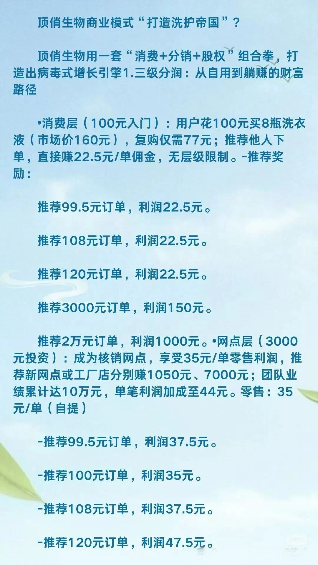 开核销点(投3000元):你可以赚卖货的差价,但更大的奖励来自“蓷荐”——蓷荐一个人也开核销点,能拿1050元;蓷荐一个人开2万的工厂店,能拿7000元。对比一下,卖一瓶洗衣液的立润可能才几块钱。很明显,拉一个人进来开店,比自己辛苦卖上百瓶货赚得还多。