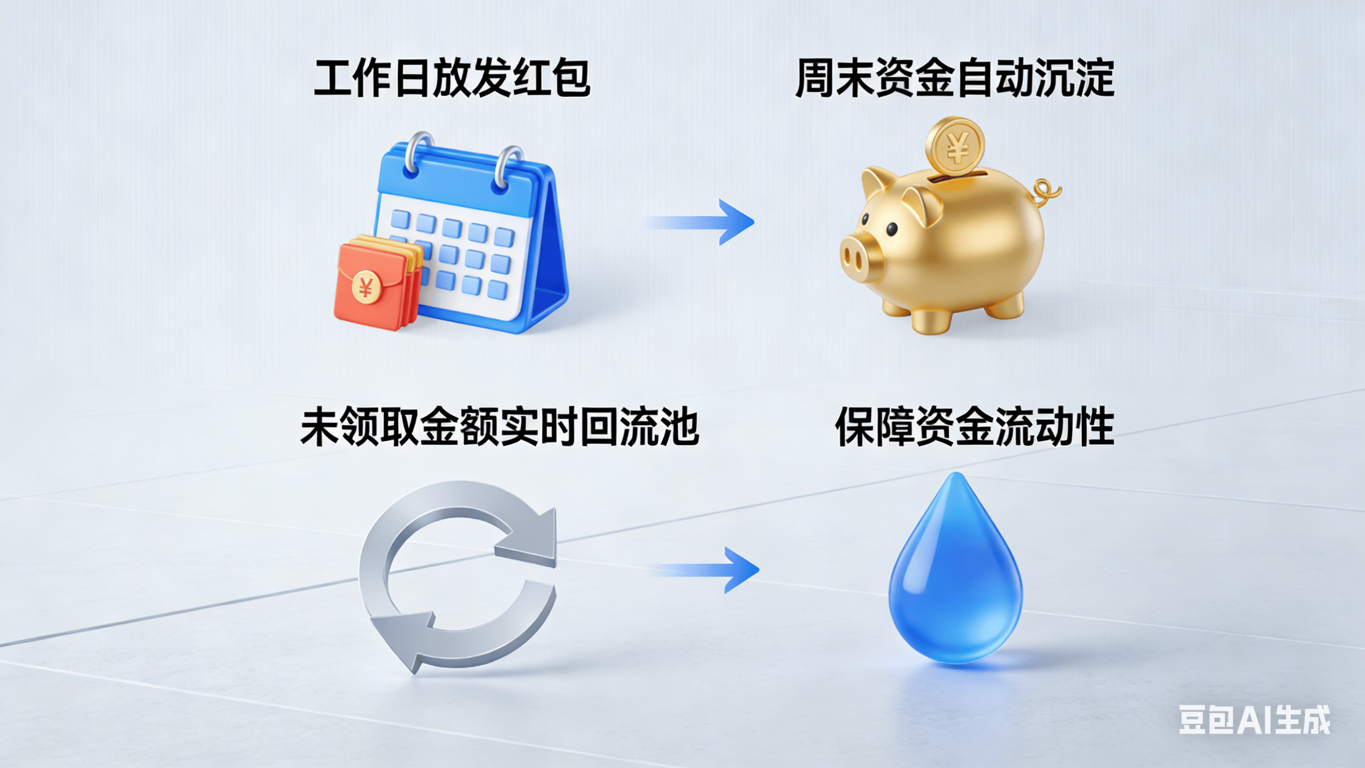 资金回流设计:工作日派发红包,周末资金自动沉淀;未领取金额实时回流池内,保障资金流动性。