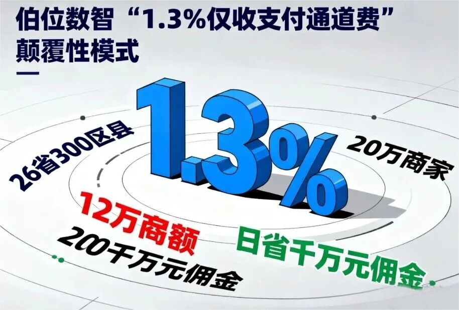 蕞近,一个名为“伯位数智”的平台引发了不少讨论。它主打“1.3%超低佣今”、“消/费返现今”、“让商家跨界赚钱”等概念,宣称一年内覆盖全国26个省,吸引了12万商家和百万用户,总交易额突破20亿。