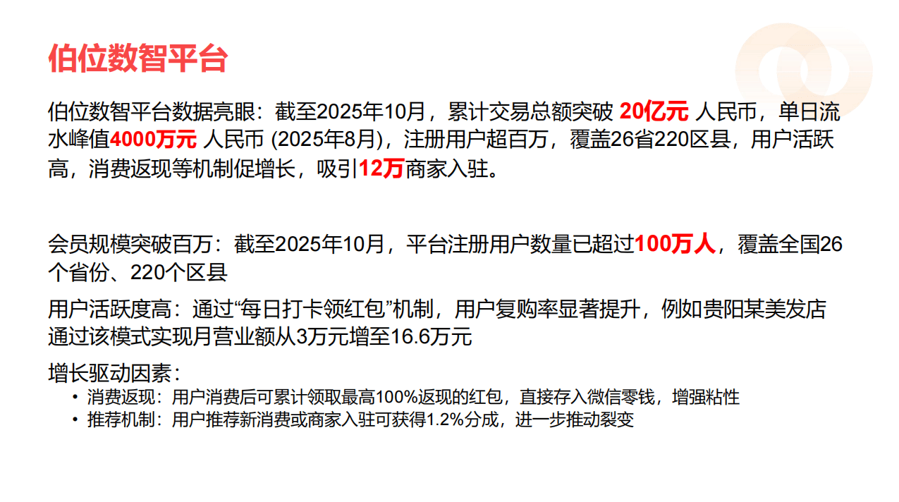 在贵阳一条普通街角,一家美发店的月营收实现了从3万元到16.6万元的跨越式增长。这一变化并非源于广告投放、网红推广,而是依托一套以“数智红包”为核心的数字激励系统。这种增长模式并非个例,该系统已覆盖全国26省、220个区县,支撑起百万级用户规模与超20亿元的累计交易额,重构了本地生活的商业生态。
