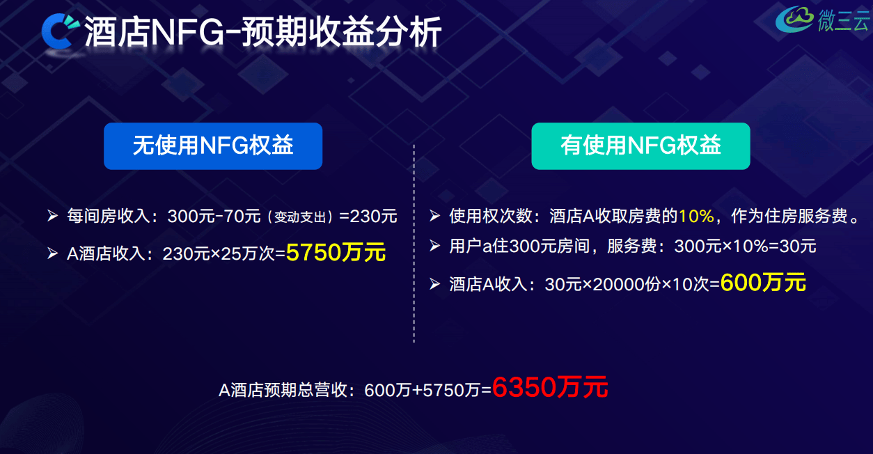 若5年内酒店相关总营收达6350万元,则每份NFG价值升至3175元,小王可通过两种方式获利:① 未用完的住宿次数转赠他人;②卖出受益权,每份可赚1175元增值收益;