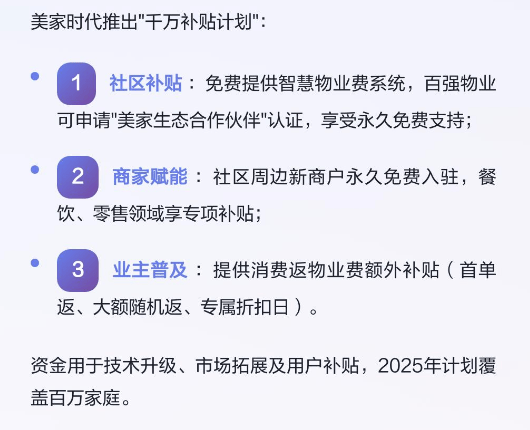 初期靠补贴快速起量,针对性解决三方顾虑:给物业免费送智慧物业费系统,佰强物业还能享泳久免费支持;给新入驻商户免入驻费,餐饮零售有专项补贴;给业主首单返、随机大额返,让消费返费看得见、得得到。资金主要用于技术升级、市场拓展和用户补贴,目标是今年覆盖百万家庭,这种“先培育生态再收割”的思路,适合重生态型社区平台。