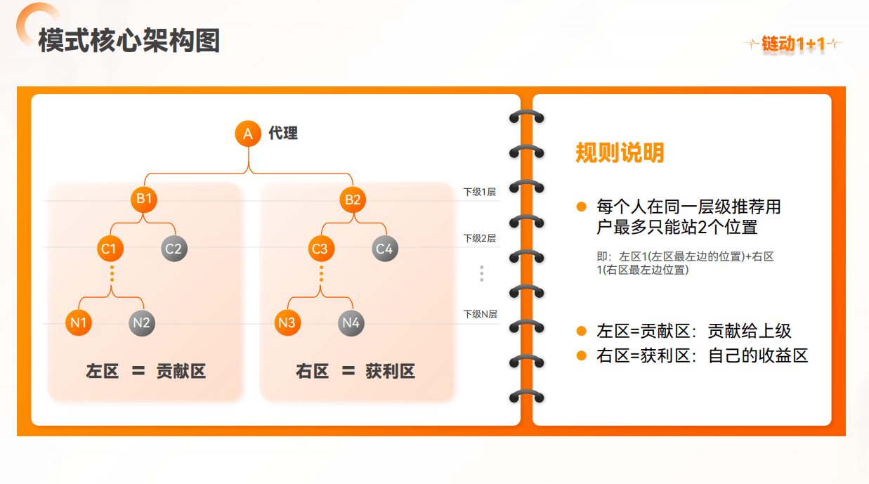 每位仅可直接推荐2位,分别占据个人左区、右区首个位置;超出2位后,后续推荐对象按“从上到下、从左到右、仅进左区”原则,自动滑落至下面团队空闲的左区。架构中左区定义为“贡献区”,资源归属上层;右区为“获利区”,收益归属于自己,形成上下资源联动的平衡结构。