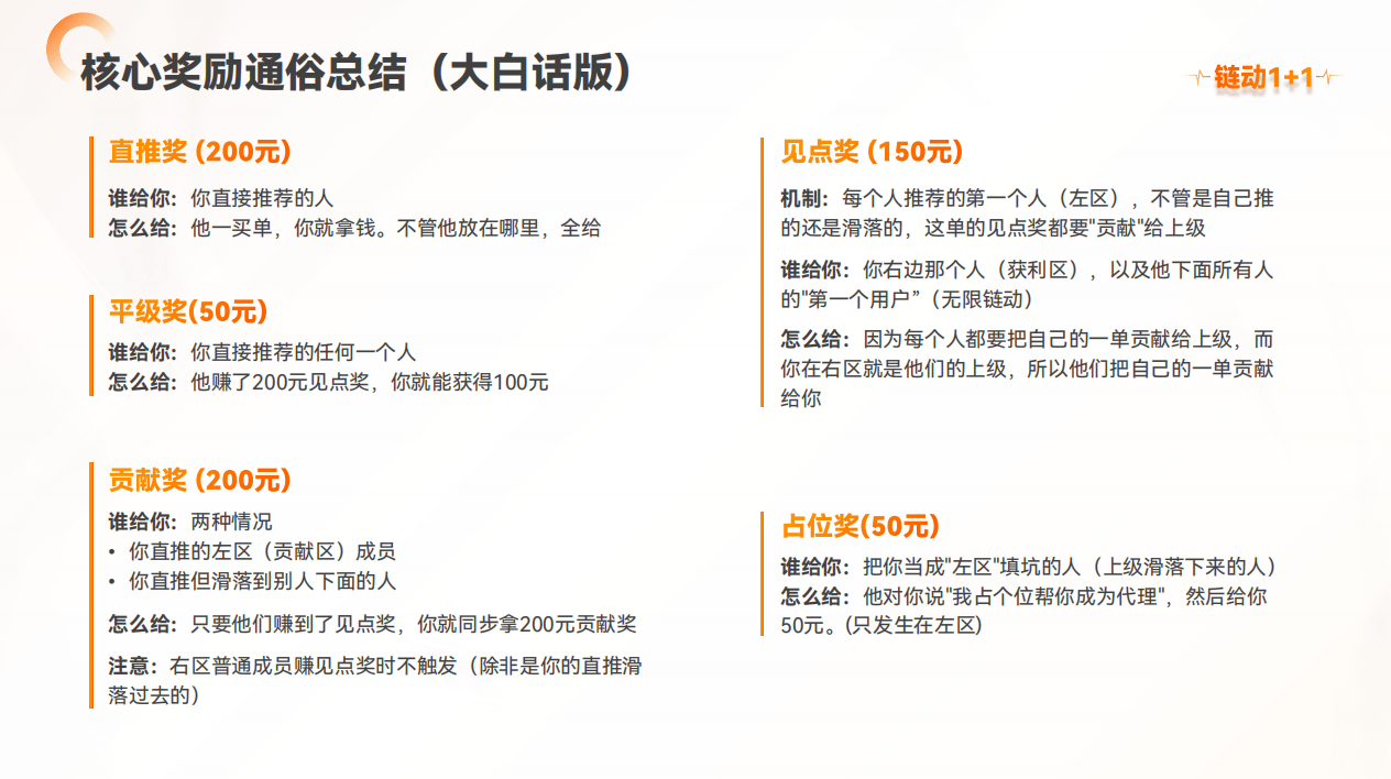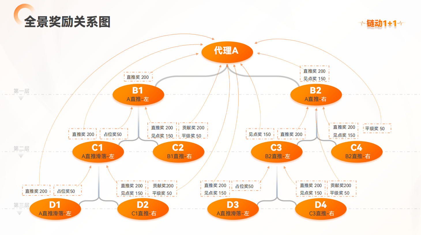 贡献奖:固定200圆/单。触发场景包括两类:一是直推左区成员获得见点奖;二是直推用户(即便已滑落至他人团队下方)获得见点奖,每触发1单即可获得对应奖励,激励用户主动帮扶直推成员。