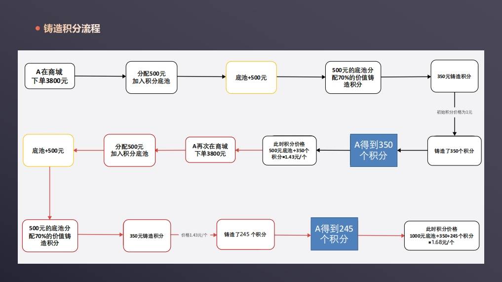 实例2:用户B后续消费1000元,平台再存入300元利润,分红池总资金达600元;按当前1.43元/个的积分单价,用户可获得约147个积分,此时积分单价更新为600÷(210+147)≈1.68元/个,积分价值持续攀升。
