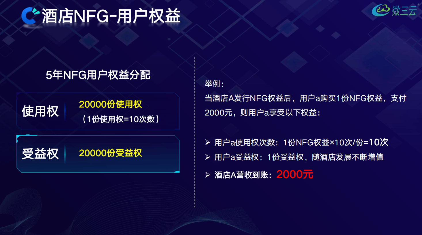 酒店将未来5年的盈利能力,拆分成20000份NFG权益,用户花费2000元购买1份,即可获得10次酒店住宿使用权,同时享受酒店未来5年的收益分红。酒店通过这种方式,立刻获得4000万元现金流,用于缓解经营压力、扩大规模;5年后,酒店总收入池达到6350万元,单份权益价值涨到3175元,用户既能用权益住宿省钱,又能通过权益增值赚钱。