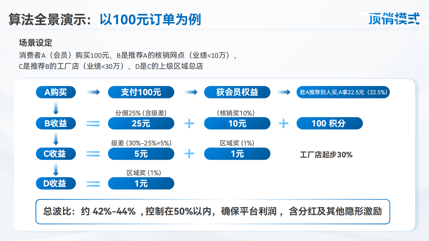 以一笔100元的商品订单为场景,拆解各角色收益分配逻辑,直观呈现模式的盈利闭环与可行性: