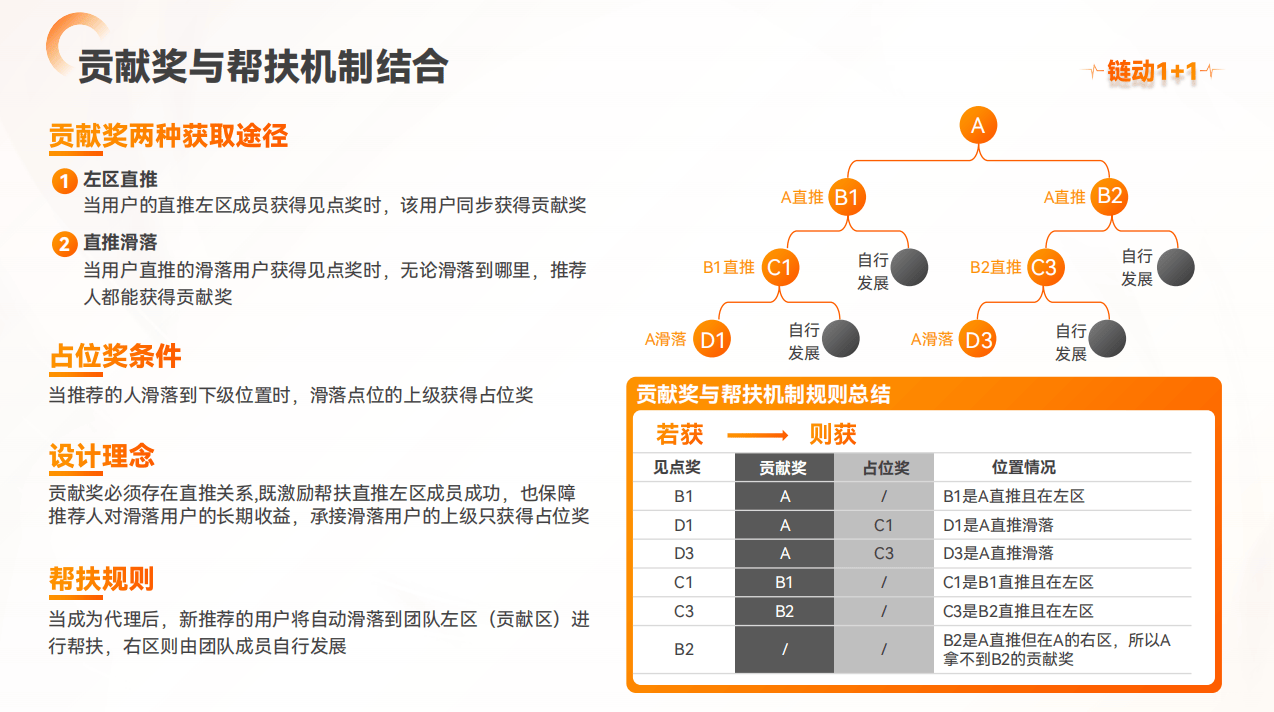 2. 贡献奖:若自身助力过的参与者(如贡献区成员、滑落至名下的成员)获得见点奖,可额外获得贡献奖励,强化参与者间的互助意愿;