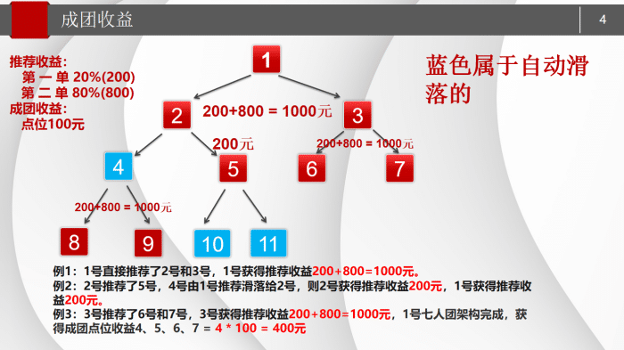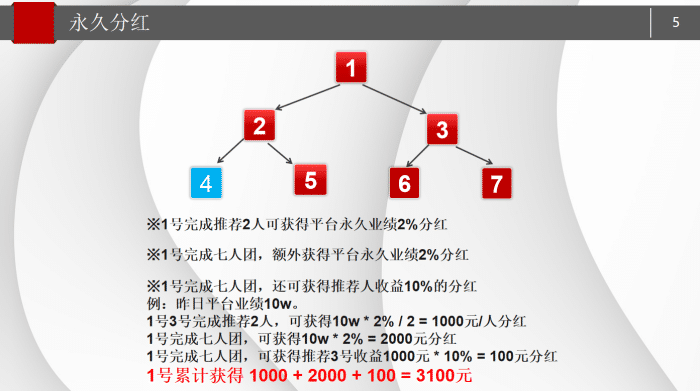 成团额外收益:用户A进一步拓展团队,组建完成1个7人团(含已推荐的B、C及新增4名用户),达成团长身份,可获得两项额外收益——①平台总业绩2%的专项分红:100000元×2%=2000元;②管理奖励:假设被推荐人B当日收益为1000元,用户A可提取其收益的10%,即1000元×10%=100元;