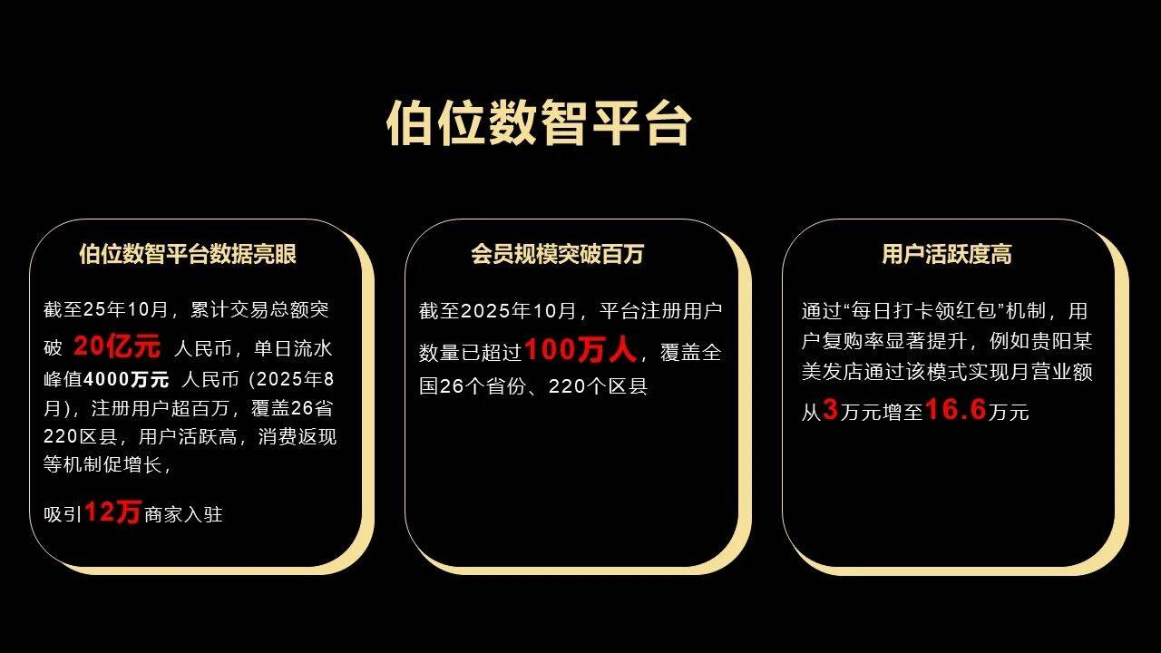 在 2025 年消费市场 “精耕战” 的背景下,粤港澳大湾区贵商首发大会上的一幕尤为瞩目 —— 伯位数智旗下 “数智红包”模式摘得金奖,以黑马之姿突围数字商业赛道。其公开数据勾勒出强劲增长曲线:业务已渗透全国 26 个省份的 300 余个区县,吸引 12万余商家主动入驻,日活跃会员突破百万级,累计交易流水超 20 亿元。