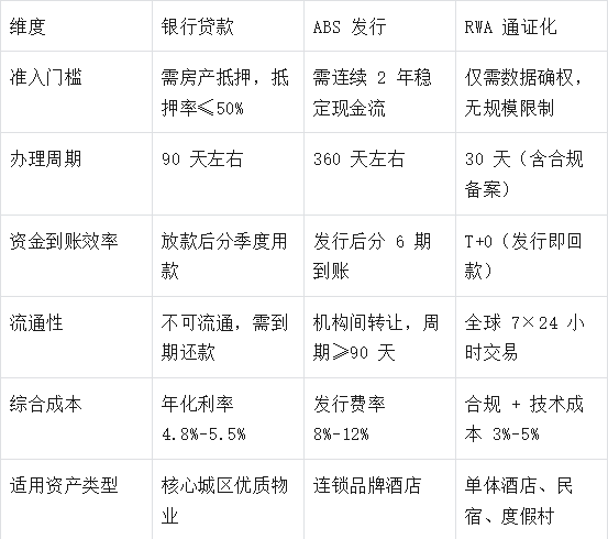 “客房率稳在 85%,但想拿资产贷笔款扩店,银行说抵押率只能给 45%;联系券商做 ABS,光尽调就要 3 个月,资金到账得等明年—— 这栋楼明明在赚钱,却比死资产还难盘活!”