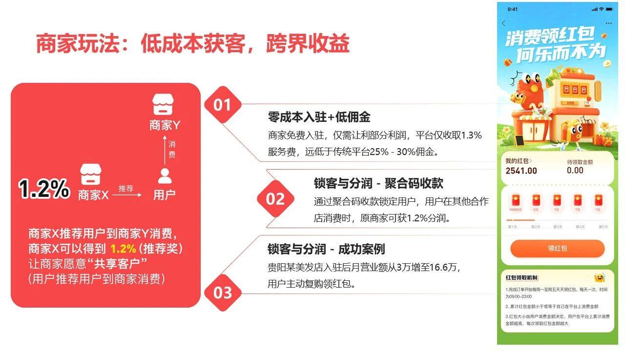 更关键的是红包池的资金来源:主要是商家自愿让利的部分,比如商家让利10%,其中 5.5% 进入红包池给用户返现,剩下 4.5%分给平台、推广者和跨界商家。“每笔钱都有去向,没有‘庞氏骗局’的空间。”