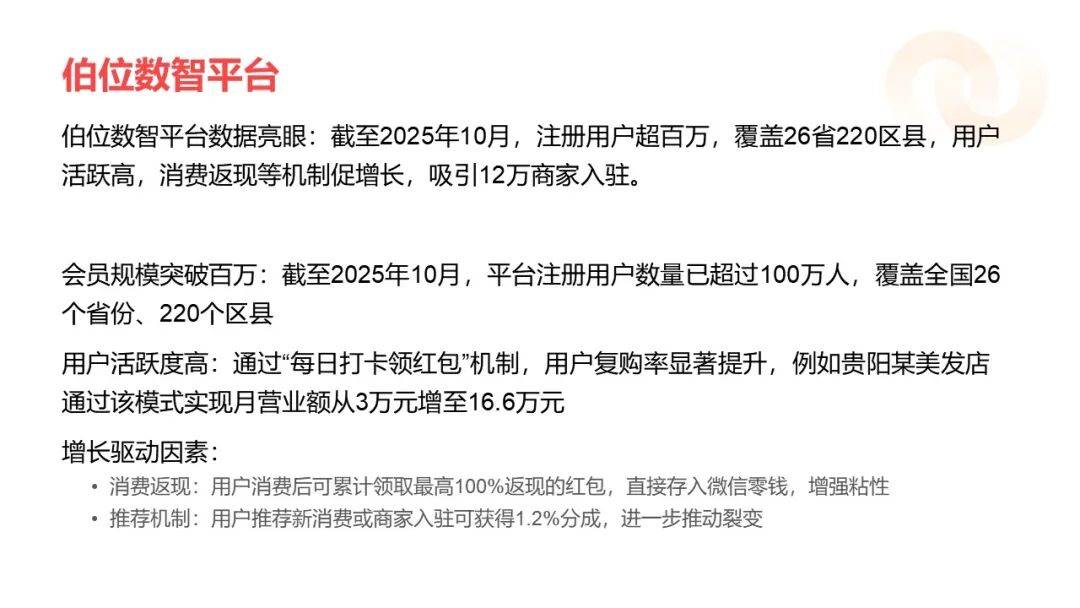 李娜的转型故事,藏着伯位数智 3 万人推广团队的增长密码。2024 年她从互联网公司辞职时,手里只有 5 个商家资源,如今管理着 40家门店的分润,月收入稳定在 20 万以上。