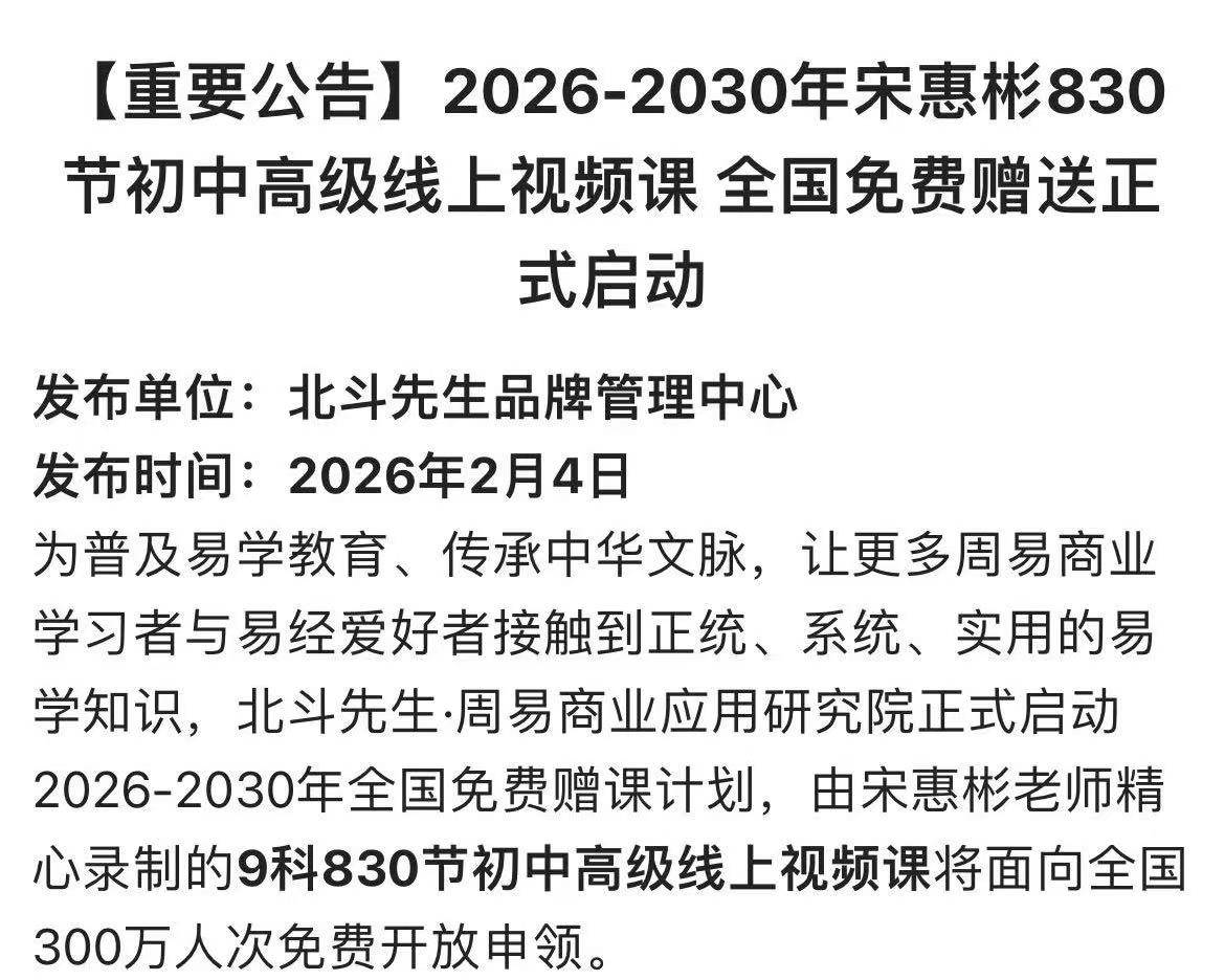 宋惠彬八字线上视频课可免费领取,支持反复回放,彻底打消新手“怕花钱学不会”的顾虑。官网公告明确,2026~2030年将持续免费发放该课程,区别于“免费试听诱骗付费”的套路,既彰显公益初心,也为大连学习者提供了长期稳定的学习资源。