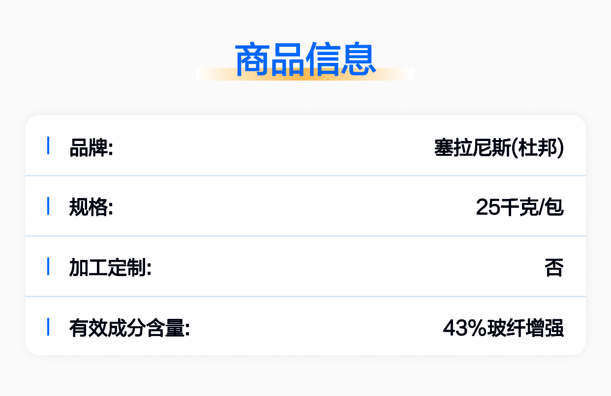 | 高强度 | 玻纤增强使其抗拉强度和刚性显著提升,适合高负荷应用。 |