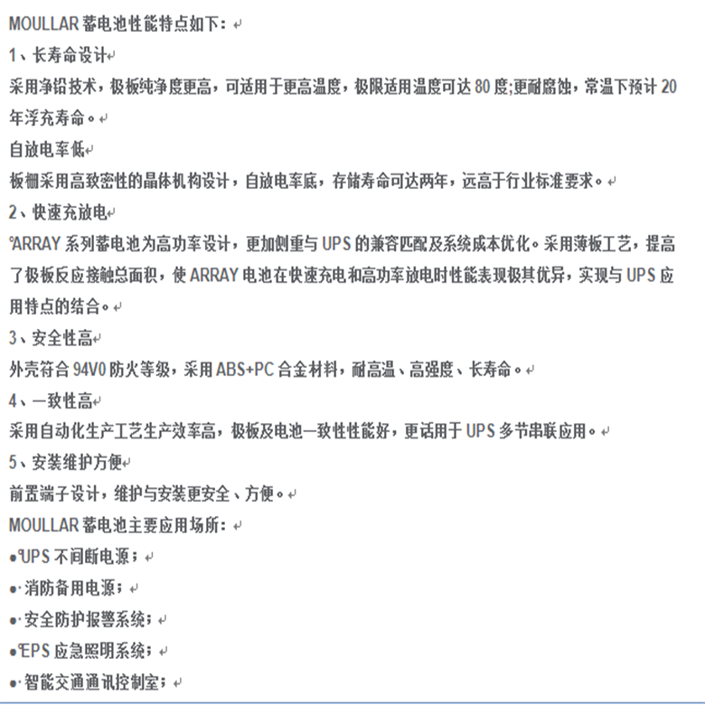 长寿命设计:采用耐腐蚀的铅钙合金板栅和特殊的电解液配方,延长了电池的使用寿命。设计寿命通常为3-5年,具体取决于使用条件和维护情况。