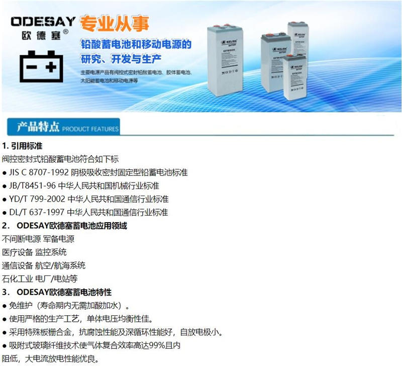 长寿命设计:采用耐腐蚀的铅钙合金板栅和特殊的电解液配方,延长了电池的使用寿命。设计寿命通常为3-5年,具体取决于使用条件和维护情况。